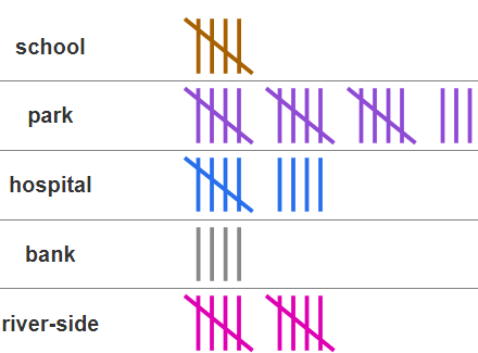 John was given the task to count the number of trees present in the prime locations. Find below the tally chart. Answer the questions, given at the bottom.