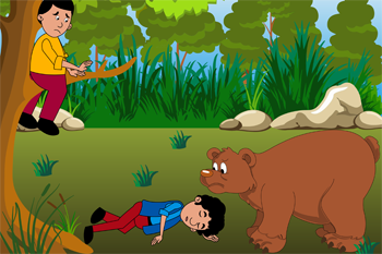 Suddenly, they saw a huge bear approaching them. One of the friends at once climbed a nearby tree. But the other one did not know how to climb. So, being led by his common sense, he lay down on the ground breathless, pretending to be a dead man.